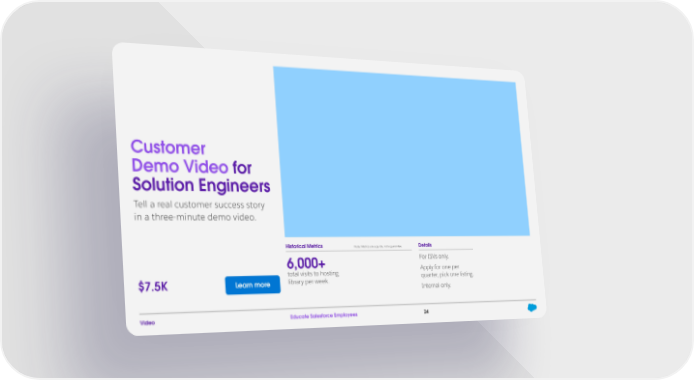 Customer Demo Video for Solution Engineers Tell a real customer success story in a three-minute demo video. Historical Metrics Note: Metrics are a guide, not a guarantee. Details 6,000+ For ISVs only. total visits to hosting Apply for one per $7.5K Learn more library per week. quarter, pick one listing. Internal only. Video Educate Salesforce Employees 24