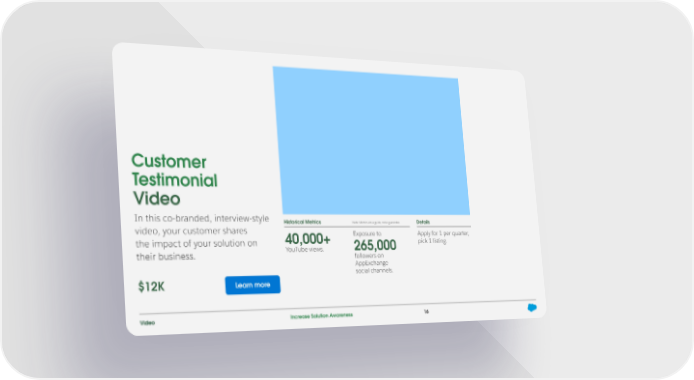 Customer Testimonial Video In this co-branded, interview-style Historical Metrics Note: Metrics are a guide, not a guarantee. Details video, your customer shares 40,000+ Exposure to Apply for 1 per quarter, the impact of your solution on 265,000 pick 1 listing. their business. YouTube views. followers on AppExchange social channels. $12K Learn more Video Increase Solution Awareness 16