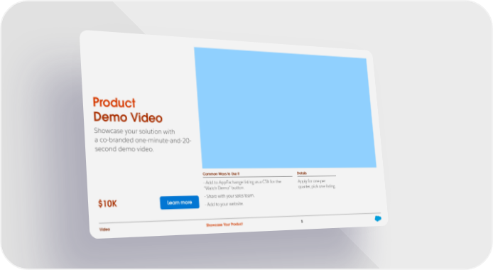 Product Demo Video Showcase your solution with a co-branded one-minute-and-20- second demo video. Common Ways to Use It Details - Add to AppExchange listing as a CTA for the Apply for one per “Watch Demo” button. quarter, pick one listing. - Share with your sales team. $10K Learn more - Add to your website. Video Showcase Your Product 5