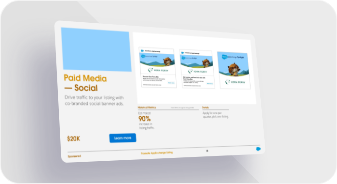 Paid Media — Social Drive traffic to your listing with co-branded social banner ads. Historical Metrics Note: Metrics are a guide, not a guarantee. Details Estimated Apply for one per 90% quarter, pick one listing. increase in listing traffic. $20K Learn more Sponsored Promote AppExchange Listing 13