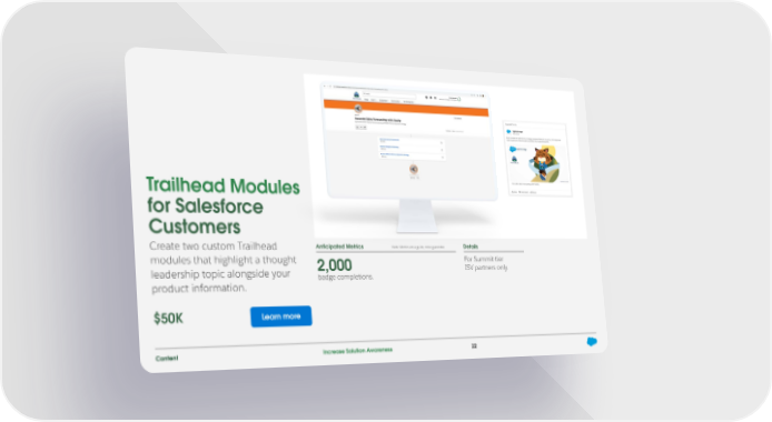 Trailhead Modules for Salesforce Customers Create two custom Trailhead Anticipated Metrics Note: Metrics are a guide, not a guarantee. Details modules that highlight a thought 2,000 For Summit-tier leadership topic alongside your ISV partners only. badge completions. product information. $50K Learn more Content Increase Solution Awareness 22
