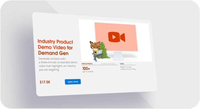 Industry Product Demo Video for Demand Gen Generate contacts with a three-minute co-branded demo Historical Metrics Note: Metrics are a guide, not a guarantee. Details video that highlights an industry 100+ Apply for one per you are targeting. quarter, pick one listing. opt-in contacts. $17.5K Learn more