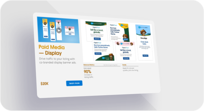 Paid Media — Display Drive traffic to your listing with co-branded display banner ads. Historical Metrics Note: Metrics are a guide, not a guarantee. Details Estimated Apply for one per 90% quarter, pick one listing. increase in listing traffic. $20K Learn more