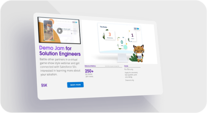 Demo Jam for Solution Engineers Battle other partners in a virtual game-show style webinar and get connected with Salesforce SEs Historical Metrics Note: Metrics are a guide, not a guarantee. Details interested in learning more about 250+ For ISVs only. your solution. SE Demo Apply for one every Jam views. two quarters, pick one listing Internal only. $5K Learn more
