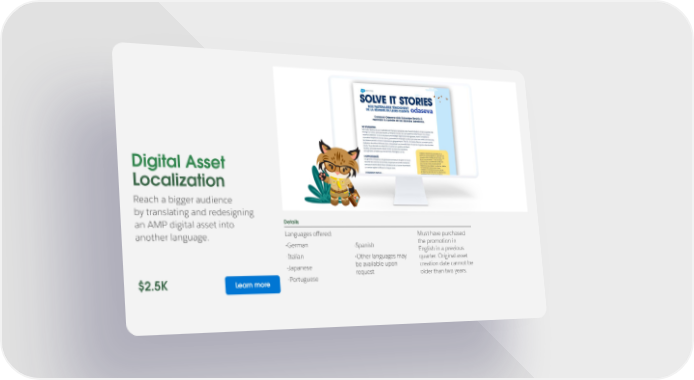 Digital Asset Localization Reach a bigger audience by translating and redesigning an AMP digital asset into Details another language. Languages offered: Must have purchased -German -Spanish the promotion in English in a previous -Italian -Other languages may quarter. Original asset -Japanese be available upon creation date cannot be request older than two years. $2.5K Learn more -Portuguese