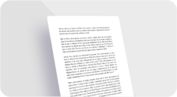 Women make up 14 percent of Uber's driver-partners, which exceeds the percentage of taxi drivers and chauffeurs who are women in those markets (eight percent), but is less than the share of women in the workforce overall. Half of Uber’s driver-partners are married, which is slightly below the corresponding figure for taxi drivers and chauffeurs, but close to the figure for all workers, probably, at least in part, a reflection of the varying age distributions. On the other hand, Uber’s driver-partners are slightly more likely to have children under the age of 18 living with them at home (Q17) than are taxi drivers and chauffeurs.9 Additionally, 71 percent of Uber’s driver-partners reported that they support financial dependents (Q19). Among those reporting an ethnic/racial background, Uber's driver-partners are more likely to identify their ethnicity/race as White Non-Hispanic than are taxi drivers and chauffeurs in the same areas, although they are less likely to identify as White Non- Hispanic than the workforce as a whole in those areas.10 Uber’s driver-partners are less likely to identify as Black/African American Non-Hispanic than are taxi drivers and chauffeurs while the percentages who identified as Asian or Pacific Islander and Hispanic/Latino are similar for the two groups. Looking beyond the 20 areas, the ethnic/racial composition of taxi drivers and chauffeurs in the United States as a whole closely matches that of Uber’s driver-partners who responded to the BSG survey.11 Uber's driver-partners are highly educated. Nearly half of Uber's driver-partners (48 percent) have a college degree or higher, considerably greater than the corresponding percentage for taxi drivers and chauffeurs (18 percent), and above that for the workforce as a whole as well (41 percent). Only 12 percent of Uber's driver-partners have a high school degree or less, whereas over half (52 percent) of taxi drivers and chauffeurs have a high school degree or less. Seven percent of Uber's driver-partners are currently enrolled in school, mostly taking classes toward a four-year college degree or higher. Higher educated individuals may be more likely to avail themselves of new technological options 9 One caveat here, however, is that the BSG question directed respondents to “include children living with you part time.” 10 The BSG and ACS race and Hispanic ethnicity questions are different because Hispanic ethnicity is listed with the other racial identities in the BSG race/ethnicity question (Q56), and then Hispanic ethnicity is also asked about specifically for all those who did not select Hispanic in Q56 in the following question (Q57). We have attempted to align the two surveys by reporting anyone who identified as Hispanic in either question as Hispanic, and then reporting the other groups exclusive of those indicating Hispanic origin, and excluding the eleven percent of respondents who did not provide an answer to Q56 or Q57. 11 The nationwide figures for taxi drivers and chauffeurs are: 42.3 percent non-Hispanic white; 24.5 percent non-Hispanic black; 12.0 percent non-Hispanic Asian; 3.1 percent non-Hispanic other; and 18.0 percent Hispanic. 8