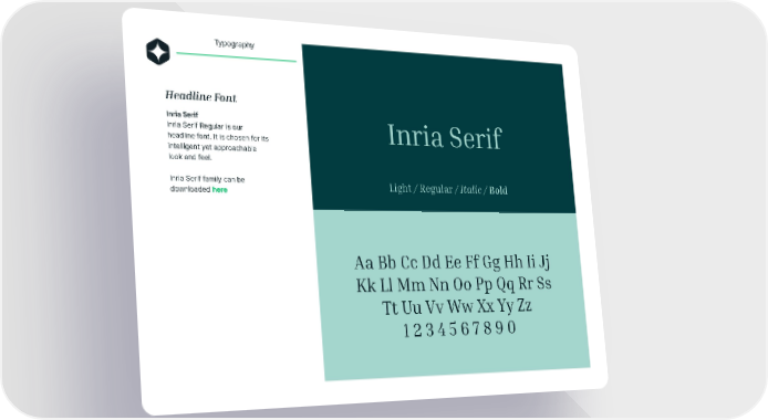 Typography Headline Font Inria Serif Inria Serif Regular is our headline font. It is chosen for its intelligent yet approachable look and feel. Inria Serif family can be downloaded here Aa Bb Cc Dd Ee Ff Gg Hh Ii Jj Kk Ll Mm Nn Oo Pp Qq Rr Ss Tt Uu Vv Ww Xx Yy Zz 1 2 3 4 5 6 7 8 9 0 Inria Serif Light / Regular / Italic / Bold