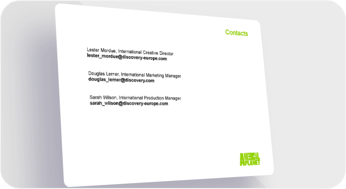 Contacts Lester Mordue, International Creative Director lester_mordue@discovery-europe.com Douglas Lerner, International Marketing Manager douglas_lerner@discovery.com Sarah Wilson, International Production Manager sarah_wilson@discovery-europe.com