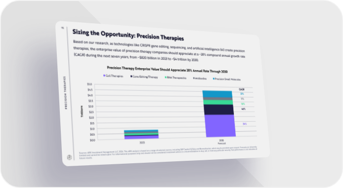 95 Sizing the Opportunity: Precision Therapies Based on our research, as technologies like CRISPR gene editing, sequencing, and artificial intelligence (AI) create precision therapies, the enterprise value of precision therapy companies should appreciate at a ~28% compound annual growth rate (CAGR)during the next seven years, from ~$820 billion in 2023 to ~$4 trillion by 2030. Precision Therapy Enterprise Value Should Appreciate 28% Annual Rate Through 2030 S Cell Therapies Gene Editing/Therapy RNA Therapeutics Antibodies Precision Small Molecules E PI A $5.0 R CAGR E $4.5 H 21% T N $4.0 O 11% I S I $3.5 C 16% E ns $3.0 PR io 46% l $2.5 il r T $2.0 $1.5 34% $1.0 $0.5 $0.0 2023 2030 Forecast Sources: ARK Investment Management LLC, 2024. This ARK analysis is based on a range of external sources, including S&P Capital IQ Data and Biomedtracker, which may be provided upon request. Forecasts are inherently limited and cannot be relied upon. For informational purposes only and should not be considered investment advice or a recommendation to buy, sell, or hold any particular security. Past performance is not indicative of future results.