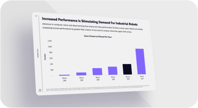 117 Increased Performance Is Stimulating Demand For Industrial Robots Advances in computer vision and deep learning have improved robot performance 33-fold in seven years. Robots are already surpassing human performance by greater than a factor of two and it’s unclear where the upper limit will be. Items Picked And Placed Per Hour 1,200 1,000 S IC T 800 O B RO 600 Number 400 200 - Robot Robot Robot Robot Human Robot 2015 2016 2018 2019 2022 2022 Sources: ARK Investment Management LLC, 2024. This ARK analysis is based on a range of underlying data from external sources, which may be provided upon request. Forecasts are inherently limited and cannot be relied upon. For informational purposes only and should not be considered investment advice or a recommendation to buy, sell, or hold any particular security. Past performance is not indicative of future results.