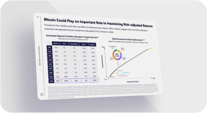 40 Bitcoin Could Play An Important Role In Maximizing Risk-Adjusted Returns Focused on the volatility and return profiles of traditional asset classes, ARK’s research suggests that a portfolio seeking to 1 maximize risk-adjusted returns would have allocated 19.4% to bitcoin in 2023. 2,3 Simulated Optimal Portfolio Allocation Targets By Year 2023 Simulated Portfolio Optimization3,4,5 6 (Rolling 5-Year As Of End Of Every Year ) Based On Monthly Asset Class Returns (No Limit, Rolling 5-Year6) Bitcoin Gold Commodities Bonds Equities Commodities High 9.6% Bitcoin Bitcoin ON 2015 0.5% 0% 0% 82.5% 16.9% 19.4% I T A 2016 0.9% 0% 0% 62.1% 36.9% 2023 OC n Tangency L r Portfolio L 2017 0.9% 0% 0% 58.7% 40.3% u Equities A t Gold e 30.2% N R 40.7% 2018 2.4% 0% 0% 77.3% 20.2% OI d C e T ct BI 2019 3.9% 1.4% 0% 70.4% 24.2% e p x E 2020 4.3% 4.1% 0% 75.6% 15.8% Equities 2021 4.7% 7.3% 0% 65.3% 22.6% Gold Commodities Real Estate 2022 6.2% 52.8% 9.1% 0% 31.8% Bonds Emerging Markets 2023 19.4% 40.7% 9.6% 0% 30.3% Low High Standard Deviation [1] Measurement of returns of an asset against its risk (in this case, volatility). [2] Real Estate and Emerging Markets are calculated out of these tangency portfolios given their low participation in maximizing risk-adjusted returns relative to the other asset classes included in this table. [3] Asset classes are represented by the following instruments: SPDR S&P 500 ETF Trust (SPY, equities), Vanguard Total Bond Market Index Fund Investor Shares (VBMFX, bonds), Vanguard Real Estate Market Index Fund Investor Shares (VGSIX, real estate), SPDR Gold Trust (GLD, gold), iShares S&P GSCI Commodity-Indexed Trust ETF (GSG, commodities), and Vanguard Emerging Markets Stock Index Fund Investor Shares (VEIEX, emerging markets). The performance used to represent each asset class reflects the net asset value (NAV) performance of each ETF/fund for the time periods shown. [4] This simulation, also known as “efficient frontier”, is a set of theoretical investment portfolios expected to provide the highest returns at multiple levels of risk. [5] The dots under the efficient frontier in the chart represent portfolios comprised of a single asset class. [6] 5 years were used since, in our view, they represent a sample of a long-term time horizon. Sources: ARK Investment Management LLC, 2024, based on data and calculation from PortfolioVisualizer.com, with bitcoin price data from Glassnode, as of December 31, 2023. For informational purposes only and should not be considered investment advice or a recommendation to buy, sell, or hold any particular security or cryptocurrency. Past performance is not indicative of future results.