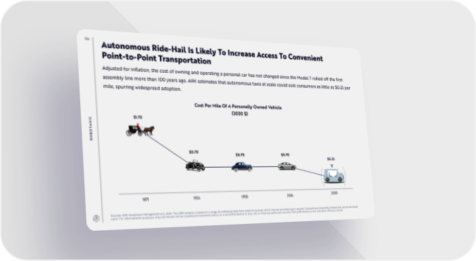 124 Autonomous Ride-Hail Is Likely To Increase Access To Convenient Point-to-Point Transportation Adjusted for inflation, the cost of owning and operating a personal car has not changed since the Model T rolled off the first assembly line more than 100 years ago. ARK estimates that autonomous taxis at scale could cost consumers as little as $0.25 per mile, spurring widespread adoption. Cost Per Mile Of A Personally Owned Vehicle (2020 $) IS $1.70 X A T O B RO $0.70 $0.70 $0.70 $0.25 2030 1871 1934 1950 2016 2021 Sources: ARK Investment Management LLC, 2024. This ARK analysis is based on a range of underlying data from external sources, which may be provided upon request. Forecasts are inherently limited and cannot be relied upon. For informational purposes only and should not be considered investment advice or a recommendation to buy, sell, or hold any particular security. Past performance is not indicative of future results.