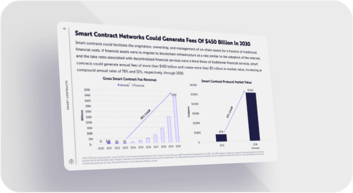 63 Smart Contract Networks Could Generate Fees Of $450 Billion In 2030 Smart contracts could facilitate the origination, ownership, and management of on-chain assets for a fraction of traditional financial costs. If financial assets were to migrate to blockchain infrastructure at a rate similar to the adoption of the internet, and the take rates associated with decentralized financial services were a third those of traditional financial services, smart contracts could generate annual fees of more than $450 billion and create more than $5 trillion in market value, increasing at compound annual rates of 78% and 32%, respectively, through 2030. Gross Smart Contract Fee Revenue Smart Contract Protocol Market Value S 1 $6,000 T Actuals Forecast C $5,300 A R $500 T $5,000 N $450 $450 O C T $400 R $4,000 A $350 SM ns R G $300 R io A ns G l $3,000 C A il io C r l $250 % T il 78 37% B $200 $2,000 $150 $100 $1,000 $775 $50 $1 $20 $- $11 $8 $- 2020 2021 2022 2023 2024 2025 2026 2027 2028 2029 2030 2023 2030 Estimate 12020-2021 data approximated using top 20 all-time fee generating protocols from Token Terminal Sources: ARK Investment Management LLC, 2024. This ARK analysis is based on a range of underlying data from external sources, which are available upon request. Forecasts are inherently limited and cannot be relied upon. For informational purposes only and should not be considered investment advice or a recommendation to buy, sell, or hold any particular security. Past performance is not indicative of future results.