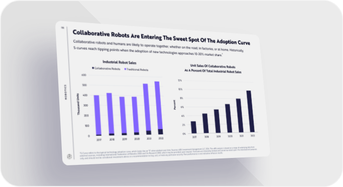 118 Collaborative Robots Are Entering The Sweet Spot Of The Adoption Curve Collaborative robots and humans are likely to operate together, whether on the road, in factories, or at home. Historically, * S-curves reach tipping points when the adoption of new technologies approaches 10-20% market share. Industrial Robot Sales Unit Sales Of Collaborative Robots Collaborative Robots Traditional Robots As A Percent Of Total Industrial Robot Sales 600 12% S 500 10% IC T O s B 400 RO nit 8% U nt ce and300 r 6% s e u P ho T 200 4% 100 2% 0 0% 2017 2018 2019 2020 2021 2022 2017 2018 2019 2020 2021 2022 *S-Curve refers to the typical technology adoption curve, which looks like an "S" when plotted over time. Sources: ARK Investment Management LLC, 2024. This ARK analysis is based on a range of underlying data from external sources, including International Federation of Robotics 2023 and Citi Research 2023, which may be provided upon request. Forecasts are inherently limited and cannot be relied upon. For informational purposes only and should not be considered investment advice or a recommendation to buy, sell, or hold any particular security. Past performance is not indicative of future results.