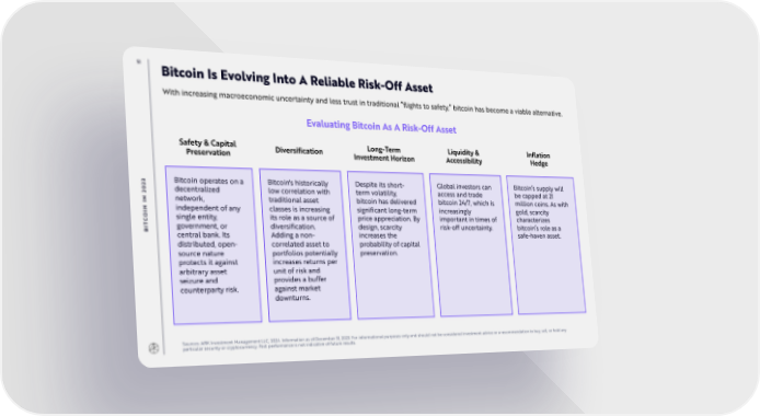 51 Bitcoin Is Evolving Into A Reliable Risk-Off Asset With increasing macroeconomic uncertainty and less trust in traditional ”flights to safety,” bitcoin has become a viable alternative. Evaluating Bitcoin As A Risk-Off Asset Safety & Capital Diversification Long-Term Liquidity & Inflation Preservation Investment Horizon Accessibility Hedge 3 Bitcoin operates on a Bitcoin's historically Despite its short- Global investors can Bitcoin’s supply will 2 0 decentralized low correlation with term volatility, access and trade be capped at 21 2 N network, traditional asset bitcoin has delivered bitcoin 24/7, which is million coins. As with I N independent of any classes is increasing significant long-term increasingly gold, scarcity OI single entity, its role as a source of price appreciation. By important in times of characterizes C T government, or diversification. design, scarcity risk-off uncertainty. bitcoin’s role as a BI central bank. Its Adding a non- increases the safe-haven asset. distributed, open- correlated asset to probability of capital source nature portfolios potentially preservation. protects it against increases returns per arbitrary asset unit of risk and seizure and provides a buffer counterparty risk. against market downturns. Sources: ARK Investment Management LLC, 2024. Information as of December 31, 2023. For informational purposes only and should not be considered investment advice or a recommendation to buy, sell, or hold any particular security or cryptocurrency. Past performance is not indicative of future results.