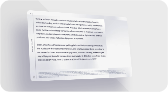76 Vertical software refers to a suite of solutions tailored to the needs of specific industries. Leading vertical software platforms are expanding rapidly into financial services for consumers and merchants. With two-sided networks, such software could facilitate closed loop transactions from consumer to merchant, merchant to employee, and employee to merchant. ARK believes that digital wallets on these platforms will enable fully closed payment ecosystems. S T E L L A Block, Shopify, and Toast are compelling platforms likely to use digital wallets as W L A T I the nucleus of their consumer, merchant, and employee ecosystems. According to G DI our research, closed loop consumer payments, merchant banking, and employee payroll/payments could increase their revenues by 22-33% at an annual rate during the next seven years, from $7 billion in 2023 to $27-$50 billion in 2030.* *In this exercise, we forecast the core revenues of Block, Shopify, and Toast to grow 22% at an annual rate over the next seven years. Summing the mentioned revenue opportunities on top of our core revenues forecast increases the annual growth rate from 22% to 33% over the next seven years. We primarily model Block’s historical revenue and future revenue opportunity across its Square merchant ecosystem and do not incorporate Cash App or Afterpay revenues independent of Square. Sources: ARK Investment Management LLC, 2024. This ARK analysis is based on a range of underlying data from external sources, which may be provided upon request. Forecasts are inherently limited and cannot be relied upon. For informational purposes only and should not be considered investment advice or a recommendation to buy, sell, or hold any particular security. Past performance is not indicative of future results.