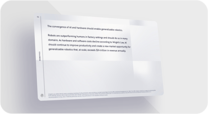 114 The convergence of AI and hardware should enable generalizable robotics. Robots are outperforming humans in factory settings and should do so in many domains. As hardware and software costs decline according to Wright’s Law, AI should continue to improve productivity and create a new market opportunity for generalizable robotics that, at scale, exceeds $24 trillion in revenue annually. S IC T O B RO Wright’s Law states that for every cumulative doubling of units produced, costs will fall by a constant percentage. Sources: ARK Investment Management LLC, 2024. This ARK analysis is based on a range of underlying data from external sources, which may be provided upon request. Forecasts are inherently limited and cannot be relied upon. For informational purposes only and should not be considered investment advice or a recommendation to buy, sell, or hold any particular security. Past performance is not indicative of future results.