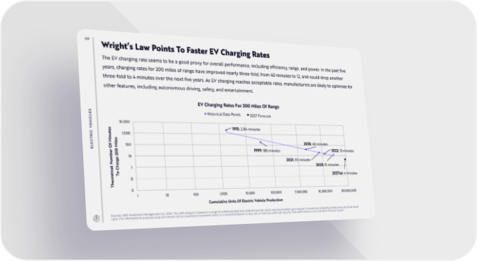 109 Wright’s Law Points To Faster EV Charging Rates The EV charging rate seems to be a good proxy for overall performance, including efficiency, range, and power. In the past five years, charging rates for 200 miles of range have improved nearly three-fold, from 40 minutes to 12, and could drop another three-fold to 4 minutes over the next five years. As EV charging reaches acceptable rates, manufacturers are likely to optimize for other features, including autonomous driving, safety, and entertainment. EV Charging Rates For 200 Miles Of Range ES Historical Data Points 2027 Forecast L IC 10,000 VEH s 1915: 2,314 minutes e IC t 1,000 R inu T s M e EC il 2018: 40 minutes f M 100 EL O r 1999: 188 minutes 2022:15 minutes e b 200 10 m ge u 2021: 20 minutes N har 2023:12 minutes icalC 1 t To e 2027(e): 4 minutes r o 0 he T 0 1 10 100 1,000 10,000 100,000 1,000,000 10,000,000 100,000,000 Cumulative Units Of Electric Vehicle Production Sources: ARK Investment Management LLC, 2024. This ARK analysis is based on a range of underlying data from external sources, which may be provided upon request. Forecasts are inherently limited and cannot be relied upon. For informational purposes only and should not be considered investment advice or a recommendation to buy, sell, or hold any particular security. Past performance is not indicative of future results.