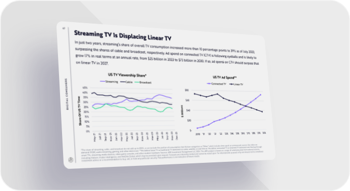 67 Streaming TV Is Displacing Linear TV In just two years, streaming’s share of overall TV consumption increased more than 10 percentage points to 39% as of July 2023, surpassing the shares of cable and broadcast, respectively. Ad spend on connected TV (CTV) is following eyeballs and is likely to grow 17% in real terms at an annual rate, from $25 billion in 2023 to $73 billion in 2030. If so, ad spend on CTV should surpass that on linear TV in 2027. US TV Viewership Share* US TV Ad Spend** S Streaming Cable Broadcast Connected TV Linear TV R E M 45% U $80 S N 40% CO e 35% L im $60 A T 30% T I V G T 25% ns DI S io $40 U 20% l il f B O 15% $ e har10% $20 S 5% 0% 1 1 1 1 2 2 2 2 2 2 3 3 3 3 3 3 $- 2 2 2 2 2 2 2 2 2 2 2 2 2 2 2 2 23 - - - - - - - - - - - - - - - - - 2018 '19 '20 '21 '22 '23E '24E '25E '26E '27E '28E '29E '30E y l p v n r y l p v n r y l p v c Ma Ju Se No Ja Ma Ma Ju Se No Ja Ma Ma Ju Se No De *The share of streaming, cable, and broadcast do not add up to 100%, as we exclude the portion of consumption that Nielsen categorizes as “Other,” which includes time spent on unmeasured sources like video-on- demand (VOD), audio streaming, gaming, and other device use. **We define linear TV as traditional TV delivered via cable, satellite, or over-the-air. We define connected TV as streamed TV delivered over-the-top through smart TVs, streaming media devices, video game consoles, and other modern hardware. Sources: ARK Investment Management LLC, 2024. This ARK analysis is based on a range of underlying data from external sources,, including Nielsen, Insider Intelligence, and MAGNA Global, which may be provided upon request. Forecasts are inherently limited and cannot be relied upon. For informational purposes only and should not be considered investment advice or a recommendation to buy, sell, or hold any particular security. Past performance is not indicative of future results.