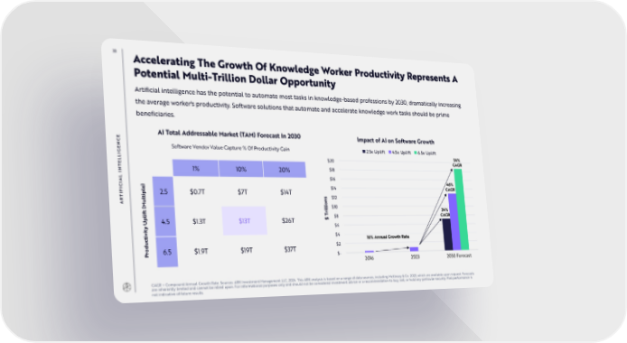 33 Accelerating The Growth Of Knowledge Worker Productivity Represents A Potential Multi-Trillion Dollar Opportunity Artificial intelligence has the potential to automate most tasks in knowledge-based professions by 2030, dramatically increasing the average worker's productivity. Software solutions that automate and accelerate knowledge work tasks should be prime beneficiaries. E AI Total Addressable Market (TAM) Forecast In 2030 Impact of AI on Software Growth C N Software Vendor Value Capture % Of Productivity Gain 2.5x Uplift 4.5x Uplift 6.5x Uplift E G I 54% L $20 L CAGR E T 1% 10% 20% $18 N I AL $16 I ) 46% C I e $14 CAGR F l I ip 2.5 $0.7T $7T $14T T t $12 l ns AR u io M l ( $10 il t r 34% if T l $8 CAGR p 4.5 $1.3T $13T $26T $ U $6 y it iv $4 t c 16% Annual Growth Rate u d $2 o 6.5 $1.9T $19T $37T Pr $- 2016 2023 2030 Forecast CAGR = Compound Annual Growth Rate. Sources: ARK Investment Management LLC, 2024. This ARK analysis is based on a range of data sources, including McKinsey & Co. 2023, which are available upon request. Forecasts are inherently limited and cannot be relied upon. For informational purposes only and should not be considered investment advice or a recommendation to buy, sell, or hold any particular security. Past performance is not indicative of future results.