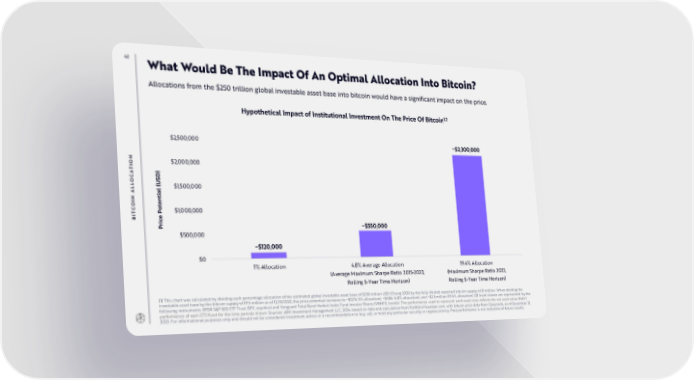 42 What Would Be The Impact Of An Optimal Allocation Into Bitcoin? Allocations from the $250 trillion global investable asset base into bitcoin would have a significant impact on the price. Hypothetical Impact of Institutional Investment On The Price Of Bitcoin1,2 $2,500,000 ~$2,300,000 ON $2,000,000 I T ) A D OC S L (U $1,500,000 L A ial N nt OI e t C o $1,000,000 T P BI ice r ~$550,000 P $500,000 ~$120,000 $0 1% Allocation 4.8% Average Allocation 19.4% Allocation (Average Maximum Sharpe Ratio 2015-2023, (Maximum Sharpe Ratio 2023, Rolling 5-Year Time Horizon) Rolling 5-Year Time Horizon) [1] This chart was calculated by dividing each percentage allocation of the estimated global investable asset base of $250 trillion USD (Chung 2021) by the fully diluted expected bitcoin supply of 21 million. When dividing the investable asset base by the bitcoin supply of 19.5 million as of 12/31/2023, the price potential increases to ~$127k (1% allocation), ~$615k (4.8% allocation), and ~$2.5 million (19.4% allocation). [2] Asset classes are represented by the following instruments: SPDR S&P 500 ETF Trust (SPY, equities) and Vanguard Total Bond Market Index Fund Investor Shares (VBMFX, bonds). The performance used to represent each asset class reflects the net asset value (NAV) performance of each ETF/fund for the time periods shown. Sources: ARK Investment Management LLC, 2024, based on data and calculation from PortfolioVisualizer.com, with bitcoin price data from Glassnode, as of December 31, 2023. For informational purposes only and should not be considered investment advice or a recommendation to buy, sell, or hold any particular security or cryptocurrency. Past performance is not indicative of future results.