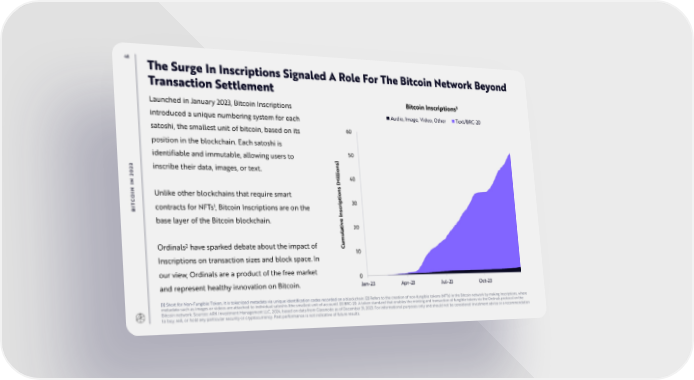 48 The Surge In Inscriptions Signaled A Role For The Bitcoin Network Beyond Transaction Settlement 3 Launched in January 2023, Bitcoin Inscriptions Bitcoin Inscriptions introduced a unique numbering system for each Audio, Image, Video, Other Text/BRC-20 satoshi, the smallest unit of bitcoin, based on its 60 position in the blockchain. Each satoshi is identifiable and immutable, allowing users to ) 50 3 inscribe their data, images, or text. ns 2 io 0 l 2 il 40 (M N I ns N Unlike other blockchains that require smart io OI t C ip 30 T 1 cr BI contracts for NFTs, Bitcoin Inscriptions are on the Ins base layer of the Bitcoin blockchain. e iv 20 at l u m 2 u Ordinals have sparked debate about the impact of C 10 Inscriptions on transaction sizes and block space. In our view, Ordinals are a product of the free market 0 and represent healthy innovation on Bitcoin. Jan-23 Apr-23 Jul-23 Oct-23 [1] Short for Non-Fungible Token, it is tokenized metadata via unique identification codes recorded on a blockchain. [2] Refers to the creation of non-fungible tokens (NFTs) in the Bitcoin network by making Inscriptions, where metadata such as images or videos are attached to individual satoshis (the smallest unit of account). [3] BRC-20: A token standard that enables the minting and transaction of fungible tokens via the Ordinals protocol on the Bitcoin network. Sources: ARK Investment Management LLC, 2024, based on data from Glassnode as of December 31, 2023. For informational purposes only and should not be considered investment advice or a recommendation to buy, sell, or hold any particular security or cryptocurrency. Past performance is not indicative of future results.