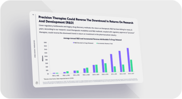 90 Precision Therapies Could Reverse The Downtrend In Returns On Research And Development (R&D) Given regulatory bottlenecks and legacy drug discovery methods, the return on therapeutic R&D has been falling for nearly 25 years. According to our research, novel therapeutic modalities and R&D methods, coupled with regulatory approval of “precision” therapies, could reverse the downward trend in return on investment in the pharmaceutical industry. AverageAnnualR&DAndIncrementalRevenueAttributableTo DrugsReleased S E $180 R&D Devoted to Drugs Released Incremental Revenue Yield PI A R $160 E H T N $140 O I S $120 I C E PR ns $100 io l il $80 B $60 $40 $20 $0 1981 to 1985 1986 to 1990 1991 to 1995 1996 to 2000 2001 to 2005 2006 to 2010 2011 to 2015 2016 to 2020 2021 to 2023* *Shorter time frame. Data impacted due to COVID. Sources: ARK Investment Management LLC, 2024. This ARK analysis is based on a range of external sources, including Biomedtracker and Ycharts, which may be provided upon request. Forecasts are inherently limited and cannot be relied upon. For informational purposes only and should not be considered investment advice or a recommendation to buy, sell, or hold any particular security. Past performance is not indicative of future results.