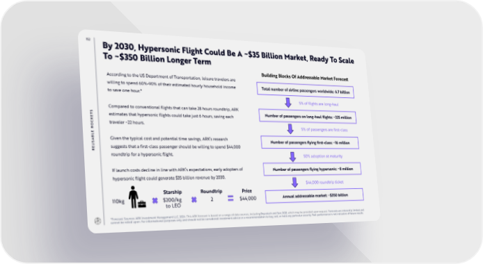 152 By 2030, Hypersonic Flight Could Be A ~$35 Billion Market, Ready To Scale To ~$350 Billion Longer Term Building Blocks Of Addressable Market Forecast According to the US Department of Transportation, leisure travelers are willing to spend 60%-90% of their estimated hourly household income Total number of airline passengers worldwide: 6.7 billion to save one hour.* 5% of flights are long-haul S Compared to conventional flights that can take 28 hours roundtrip, ARK T estimates that hypersonic flights could take just 6 hours, saving each Number of passengers on long-haul flights: ~335 million E K C traveler ~22 hours. RO 5% of passengers are first-class E L B Given the typical cost and potential time savings, ARK’s research A Number of passengers flying first-class: ~16 million S U suggests that a first-class passenger should be willing to spend $44,000 RE roundtrip for a hypersonic flight. 50% adoption at maturity If launch costs decline in line with ARK’s expectations, early adopters of Number of passengers flying hypersonic: ~8 million hypersonic flight could generate $35 billion revenue by 2030. $44,000 roundtrip ticket Starship Roundtrip Price 110kg $200/kg 2 $44,000 Annual addressable market: ~$350 billion to LEO *Forecast. Sources: ARK Investment Management LLC, 2024. This ARK forecast is based on a range of data sources, including Brycetech and Saic 2021, which may be provided upon request. Forecasts are inherently limited and cannot be relied upon. For informational purposes only and should not be considered investment advice or a recommendation to buy, sell, or hold any particular security. Past performance is not indicative of future results.