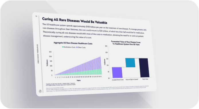 94 Curing All Rare Diseases Would Be Valuable The US healthcare system spends approximately $450 billion per year on the treatment of rare diseases. To manage patients with rare diseases throughout their lifetimes, the cost could mount to $20 trillion, of which less than half would be for medication. Theoretically, curing all rare diseases would shift most of the costs to medication, obviating the need for in- and out-patient disease management, underscoring the value of a cure. Forecasted Value of Rare Disease Cures Aggregate US Rare Disease Healthcare Costs To Healthcare System Over 50 Years S $25 E Medication Costs Other Costs PI A R E $25 $20 H T N O $20 I S $15 I s C n E ns $15 o i io l PR l l i il Tr r $10 T $10 $5 $5 $- 1 3 5 7 9 11 13 15 17 19 21 23 25 27 29 31 33 35 37 39 41 43 45 47 49 51 $0 Years Avoided Direct Costs Value of QALYs Gained* Total Value *Quality of Life Years Gained = Health Utility * Duration For Health Utility, 0 means dead and 1 means full health Data are as of December of 2023 Sources: ARK Investment Management LLC, 2024. This ARK analysis is based on a range of external sources, including Orphanet 2023, which may be provided upon request. Forecasts are inherently limited and cannot be relied upon. For informational purposes only and should not be considered investment advice or a recommendation to buy, sell, or hold any particular security. Past performance is not indicative of future results.