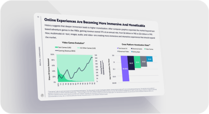 70 Online Experiences Are Becoming More Immersive And Monetizable History suggests that deeper immersion leads to higher monetization. After computer graphics expanded the market beyond text- based adventure games in the 1980s, gaming revenue soared 19% at an annual rate, from $6 billion in 1985 to $24 billion in 1993. Now, multimodal AI—text, images, audio, and video—are creating more immersive and interactive experiences that should expand the market. Video Games Evolution* Gross Platform Monetization Rates** S Text Games (LHS) All Other Games (LHS) Text-based AI Streamed Audio Video Games R E Gaming Revenue (RHS) Streamed Video Dating Apps M U S 100% $45 $10 N $10.000 CO $40 r $1.40 L d 80% u A e $35 * o T e * H $0.15 $0.23 I as $1 )* $1.000 G e nu r $0.07 l $30 e ns e DI e 60% v P R e io $25 l n s R il e B io $0.0016 $0.1 $20 ing 3 at $0.100 Gam40% 2 iz 0 t f $15 Gam2 ne O ($ o e 20% $10 M $0.010 har t $0.01 S $5 e N 0% 5 7 9 1 3 5 7 9 1 3 5 7 9 1 3 5 $- 7 $0.001 19 '7 '7 '8 '8'8 '8 '8 '9 '9'9 '9 '9 '0'0 '0 $0.001 *”Text games” refer to both text-based and spreadsheet-based games. “All other games” exclude arcade game releases. Gaming revenue captures PC and console gaming revenue only **We estimate various platforms’ ability to monetize on direct consumer spend only.. ***Revenue figures have been inflation-adjusted to 2023 US Dollars. Sources: ARK Investment Management LLC, 2024. This ARK analysis is based on a range of underlying data from external sources, which may be provided upon request. Forecasts are inherently limited and cannot be relied upon. For informational purposes only and should not be considered investment advice or a recommendation to buy, sell, or hold any particular security. Past performance is not indicative of future results.