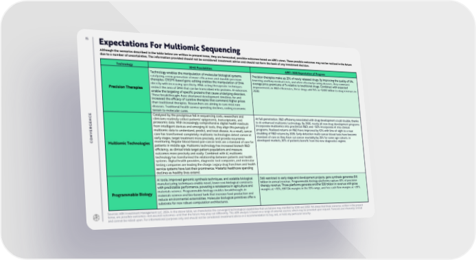 15 Expectations For Multiomic Sequencing Although the scenarios described in the table below are written in present tense, they are forecasted, possible outcomes based on ARK's views. These possible outcomes may not be realized in the future due to a number of uncertainties. The information provided should not be considered investment advice and should not form the basis of any investment decision. Technology 2040 Possibilities ARK’s 2030 Expectation of Progress Technology enables the manipulation of molecular biological systems, Precision therapies make up 25% of newly released drugs. By improving the quality of life, catalyzing a new generation of more efficacious and durable precision lowering ancillary medical costs, and often effectively curing diseases, they command therapies. CRISPR-based gene-editing enables the manipulation of DNA average price premiums of 7x relative to traditional drugs. Combined with expected directly with increasing specificity. RNA-acting therapeutic techniques improvements in R&D efficiencies, these drugs add 15% or ~$300 billion to drug revenues in Precision Therapies restrict the area of DNA that can be transcribed into proteins. AI-advances 2030. enable the targeting of specific proteins that cause underlying disorders. These breakthroughs have shortened development timelines for and increased the efficacy of curative therapies that command higher prices than traditional therapies. Researchers are aiming to cure most rare diseases. Traditional health service spending declines, ceding economic terrain to molecular cures. CE Catalyzed by the precipitous fall in sequencing costs, researchers and At full penetration, R&D efficiency associated with drug development could double, thanks N clinicians routinely collect patients’ epigenomic, transcriptomic, and to AI-enhanced multiomic technology. By 2030, nearly all new drug development programs E proteomic data. With increasingly comprehensive digital health readouts incorporate multiomics into preclinical R&D, and ~50% incorporate AI into clinical G from intelligent devices and emerging AI tools, they align this panoply of programs. Realized returns on R&D have improved by 10% with line-of-sight to a near R multiomic data to understand, predict, and treat disease. As a result, cancer E doubling of R&D returns by 2035. Early detection multi-cancer blood tests have become V care has transformed completely: multiomic technologies detect cancer at standard of care as they have cut cancer mortality by 25% for some age cohorts. In N early stages, target treatment more precisely, and provide recurrence CO Multiomic Technologies monitoring. Regular blood-based pan-cancer tests are a standard of care for developed markets, 30% of patients benefit from the new diagnostics regime. patients in middle age. Multiomic technology has increased biotech R&D efficiency, as clinical trials target patient populations and measure outcomes more precisely and easily. Combined with AI, multiomic technology has transformed the relationship between patients and health systems. Digital health providers, diagnostic tool companies, and molecular testing companies are leading the charge. Legacy drug franchises and health service systems have lost their prominence. Wasteful healthcare spending declines as healthy lives extend. AI tools, improved genomic synthesis techniques, and scalable biological Still restricted to early stage and development projects, gene synthesis generates $10 manufacturing techniques enable novel, lower cost biological constructs billion in annual revenue. Programmable biology platforms capture 10% of precision with predictable performance, powering a renaissance in agriculture and therapy revenue. Those platforms generate another $30 billion in revenue with gross Programmable Biology materials science. Programmable biology enables breakthroughs in margins at ~70%, EBITDA margins in the 35% range, and free cash flow margins at ~20%. materials science and bio-based fuels that increase food production and reduce environmental externalities. Molecular biological primitives offer a substrate for new robust computation architectures. Sources: ARK Investment Management LLC, 2024. In the above table, we characterize the convergent technological capabilities that we believe may manifest by 2030 and 2050. We stress that these scenarios, written in the present tense, are possible outcomes—not assured outcomes—and that the future may play out differently. This ARK analysis is based on a range of external sources, which may be provided upon request. Forecasts are inherently limited and cannot be relied upon. For informational purposes only and should not be considered investment advice or a recommendation to buy, sell, or hold any particular security.