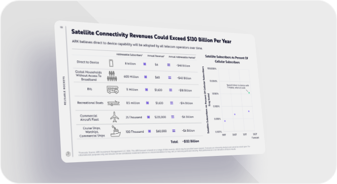 151 Satellite Connectivity Revenues Could Exceed $130 Billion Per Year ARK believes direct to device capability will be adopted by all telecom operators over time. Addressable Subscribers* Annual Revenue* Annual Addressable Market* Satellite Subscribers As Percent Of Cellular Subscribers Direct to Device 8 billion $6 ~$48 Billion s r 100.000% e ib cr Global Households s b Without Access To 600 Million $60 ~$40 Billion u S S 10.000% T Broadband ar E l SpaceX direct to device with K u l C l T-Mobile, when at scale e C RO RVs 11 Million $1,620 ~$18 Billion f E O ) 1.000% L e B nt A ce cal S r S U e g Recreational Boats 8.5 million $1,620 ~$14 Billion P o RE (L As 0.100% s r e Commercial ib 25 Thousand $225,000 ~$6 Billion cr Aircraft Fleet s b 0.010% u S e Cruise Ships, it l l Warships, 100 Thousand $60,000 ~$6 Billion e at 0.001% Commercial Ships S 1997 2007 2017 2027 Total: ~$132 Billion Forecast *Forecasts. Source: ARK Investment Management LLC, 2024. This ARK forecast is based on a range of data sources, which may be provided upon request. Forecasts are inherently limited and cannot be relied upon. For informational purposes only and should not be considered investment advice or a recommendation to buy, sell, or hold any particular security. Past performance is not indicative of future results.