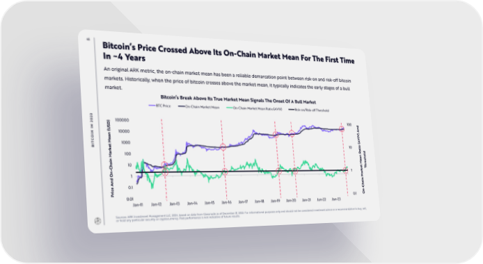 45 Bitcoin’s Price Crossed Above Its On-Chain Market Mean For The First Time In ~4 Years An original ARK metric, the on-chain market mean has been a reliable demarcation point between risk-on and risk-off bitcoin markets. Historically, when the price of bitcoin crosses above the market mean, it typically indicates the early stages of a bull market. Bitcoin’s Break Above Its True Market Mean Signals The Onset Of A Bull Market BTC Price On-Chain Market Mean On-Chain Market Mean Ratio (AVIV) Risk-on/Risk-off Threshold 3 2 0 ) 100000 100 2 D N S I And (U 10000 N an OI e C M (AVIV) T 1000 BI t io e 10 k at d ar 100 R l M an ho e s M e hain 10 hr C t T - e n 1 k O 1 ar M And 0.1 hain ice C r - P On 0.01 0.1 Jan-11 Jan-12 Jan-13 Jan-14 Jan-15 Jan-16 Jan-17 Jan-18 Jan-19 Jan-20 Jan-21 Jan-22 Jan-23 Sources: ARK Investment Management LLC, 2024, based on data from Glassnode as of December 31, 2023. For informational purposes only and should not be considered investment advice or a recommendation to buy, sell, or hold any particular security or cryptocurrency. Past performance is not indicative of future results.