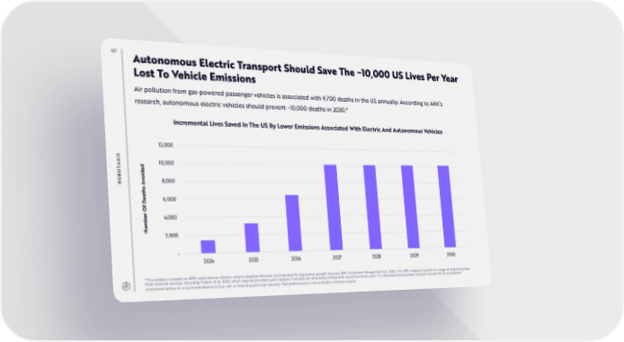 127 Autonomous Electric Transport Should Save The ~10,000 US Lives Per Year Lost To Vehicle Emissions Air pollution from gas-powered passenger vehicles is associated with 9,700 deaths in the US annually. According to ARK’s research, autonomous electric vehicles should prevent ~10,000 deaths in 2030.* Incremental Lives Saved In The US By Lower Emissions Associated With Electric And Autonomous Vehicles 12,000 IS X 10,000 A d T e O id B o RO Av 8,000 hs at e 6,000 D f O r e 4,000 b m u N 2,000 - 2024 2025 2026 2027 2028 2029 2030 *This analysis is based on ARK’s autonomous electric vehicle adoption forecast and adjusted for population growth. Sources: ARK Investment Management LLC, 2024. This ARK analysis is based on a range of underlying data from external sources, including Thakrar et al. 2020, which may be provided upon request. Forecasts are inherently limited and cannot be relied upon. For informational purposes only and should not be considered investment advice or a recommendation to buy, sell, or hold any particular security. Past performance is not indicative of future results.