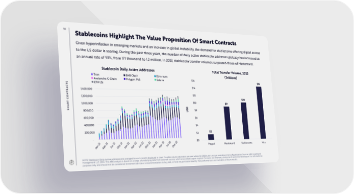 56 Stablecoins Highlight The Value Proposition Of Smart Contracts Given hyperinflation in emerging markets and an increase in global instability, the demand for stablecoins offering digital access to the US dollar is soaring. During the past three years, the number of daily active stablecoin addresses globally has increased at an annual rate of 93%, from 171 thousand to 1.2 million. In 2023, stablecoin transfer volumes surpassed those of Mastercard. Stablecoin Daily Active Addresses Total Transfer Volume, 2023 Tron BNB Chain Ethereum (Trillions) Avalanche C-Chain Polygon PoS Solana $16 $15 S ETH L2s T $14 C A 1,400,000 R T $12 N 1,200,000 O $10 C T $10 $9 R 1,000,000 A D SM 800,000 US $8 600,000 $6 400,000 $4 200,000 $2 $2 - $0 1 1 1 1 2 2 2 2 3 3 3 3 2 2 2 2 2 2 2 2 2 2 2 2 - - - - - - - - - - - - n r l t n r l t n r l t Paypal Mastercard Stablecoins Visa Ja Ap Ju Oc Ja Ap Ju Oc Ja Ap Ju Oc NOTE: Stablecoin Daily Active Addresses are averaged for each month displayed in chart. Transfer volume estimates are used where Q4 2023 data is not yet available at time of publication. Sources: ARK Investment Management LLC, 2024. This ARK analysis is based on a range of underlying data from external sources, which are available upon request. Forecasts are inherently limited and cannot be relied upon. For informational purposes only and should not be considered investment advice or a recommendation to buy, sell, or hold any particular security. Past performance is not indicative of future results.