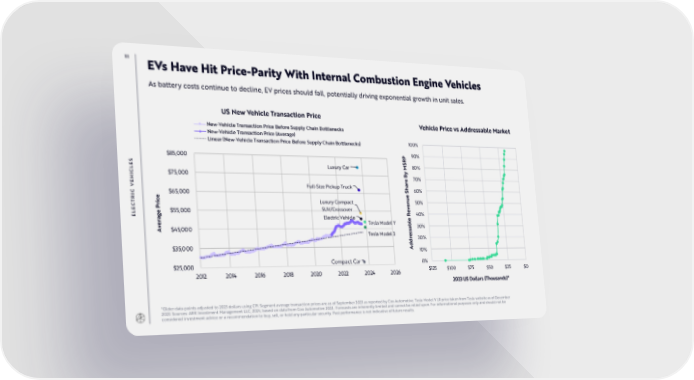 111 EVs Have Hit Price-Parity With Internal Combustion Engine Vehicles As battery costs continue to decline, EV prices should fall, potentially driving exponential growth in unit sales. US New Vehicle Transaction Price Vehicle Price vs Addressable Market New-Vehicle Transaction Price (Average) New-Vehicle Transaction Price Before Supply Chain Bottlenecks Linear (New-Vehicle Transaction Price Before Supply Chain Bottlenecks) 100% $85,000 P 90% R S 80% ES Luxury Car M L y $75,000 B IC 70% e VEH Full-Size Pickup Truck har S 60% IC $65,000 R e T ice Luxury Compact nu 50% r e EC P v $55,000 SUV/Crossover e EL R 40% age Electric Vehicle r e e Tesla Model Y l $45,000 ab 30% Av s Tesla Model 3 s e r 20% d $35,000 Ad 10% $25,000 Compact Car 0% 125 100 75 50 25 0 2012 2014 2016 2018 2020 2022 2024 2026 $125 $100 $75 $50 $25 $0 2023 US Dollars (Thousands)* *Older data points adjusted to 2023 dollars using CPI. Segment average transaction prices are as of September 2023 as reported by Cox Automotive. Tesla Model Y LR price taken from Tesla website as of December 2023. Sources: ARK Investment Management LLC, 2024, based on data from Cox Automotive 2023.. Forecasts are inherently limited and cannot be relied upon. For informational purposes only and should not be considered investment advice or a recommendation to buy, sell, or hold any particular security. Past performance is not indicative of future results.