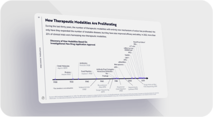 89 New Therapeutic Modalities Are Proliferating During the last thirty years, the number of therapeutic modalities with entirely new mechanisms of action has proliferated. Not only have they expanded the number of treatable diseases, but they have also improved efficacy and safety. In 2023, more than 25% of clinical trials were harnessing new therapeutic modalities. Discovery of New Modalities Based On Base/Prime Editors* Investigational New Drug Application Approval TPDs γδ T-cells mRNA Vaccines S CRISPR/Cas9 E iPSCs PI A R TALENS E H CAR-T T N ZFNs O I siRNA/RNAi S I Antibiotics C RNA Aptamers E Small Molecules Penicillin (1928) PR Aspirin (1899) ASOs Antibody-Drug Conjugates Proteins Small Peptides Monoclonal Antibodies Insulin (1921) Oxytocin (1953) TILs Prodrugs 1900 1920 1940 1960 1980 2000 2020 Watson & Crick Recombinant Single Molecule Real *This timeline is not exhaustive. (1953) DNA (1972) Polymerase Sequencing by Time Sequencing (2011) Sanger Sequencing Chain Reaction Synthesis (1996) (1977) (1982) Sources: ARK Investment Management LLC, 2024. This ARK analysis is based on a range of external sources, including Biomedtracker, which may be provided upon request. Forecasts are inherently limited and cannot be relied upon. For informational purposes only and should not be considered investment advice or a recommendation to buy, sell, or hold any particular security. Past performance is not indicative of future results.