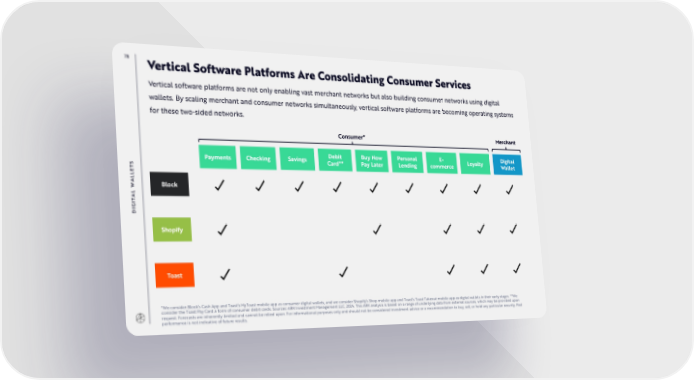 78 Vertical Software Platforms Are Consolidating Consumer Services Vertical software platforms are not only enabling vast merchant networks but also building consumer networks using digital wallets. By scaling merchant and consumer networks simultaneously, vertical software platforms are becoming operating systems for these two-sided networks. Consumer* Merchant Payments Checking Savings Debit Buy Now Personal E- Loyalty Digital S Card** Pay Later Lending commerce Wallet T E L L A Block W L A T I G DI Shopify Toast *We consider Block’s Cash App and Toast’s MyToast mobile app as consumer digital wallets, and we consider Shopify’s Shop mobile app and Toast’s Toast Takeout mobile app as digital wallets in their early stages. **We consider the Toast Pay Card a form of consumer debit cards. Sources: ARK Investment Management LLC, 2024. This ARK analysis is based on a range of underlying data from external sources, which may be provided upon request. Forecasts are inherently limited and cannot be relied upon. For informational purposes only and should not be considered investment advice or a recommendation to buy, sell, or hold any particular security. Past performance is not indicative of future results.