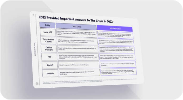 46 2023 Provided Important Answers To The Crises In 2022 Entity 2022 Crisis 2023 Resolution Luna, UST Algorithmic stablecoin UST collapsed, causing a significant sell-off in Founder Do Kwon was arrested and faces eight indictments in Manhattan’s its sister cryptocurrency, LUNA, erasing over 60 billion USD in market U.S. District Court, while his startup, Terraform Labs, faces SEC civil charges value.* for orchestrating a multi-billion-dollar securities fraud. Three Arrows LUNA’s collapse led high profile hedge fund Three Arrows Capital The Monetary Authority of Singapore banned 3AC’s co-founders from capital Capital (3AC) into a liquidity crisis, forcing it into bankruptcy. markets activity for nine years, and a court in the British Virgin Islands froze 3 their assets. 2 0 2 A bankruptcy court approved a restructuring plan for Celsius that will return Celsius N Crypto lending platform Celsius froze withdrawals and then filed for assets to customers and establish a new company focused on mining and I Network bankruptcy. staking. CEO Alex Mashinsky faces criminal charges for allegedly misleading N customers. OI C T BI After Coindesk exposed the fraudulent financial entanglement The Southern District of New York convicted Sam Bankman-Fried on seven FTX between trading firm Alameda and FTX, FTX suffered a bank run and counts of fraud related to the collapse of FTX. A bankruptcy court granted collapsed. the FTX estate approval to sell its assets. BlockFi BlockFi’s exposure to FTX forced it into bankruptcy. BlockFi received court approval to liquidate, with partial in-kind repayment to creditors. With significant loans to 3AC, crypto lender Genesis declared Crypto lender Genesis reached a settlement with parent company DCG, Genesis bankruptcy. involving $620 million in repayments. The SEC is suing Genesis for selling unregistered securities. *This data point is sourced from Corva 2022. Sources: ARK Investment Management LLC, 2024. Information as of December 31, 2023. For informational purposes only and should not be considered investment advice or a recommendation to buy, sell, or hold any particular security or cryptocurrency. Past performance is not indicative of future results.