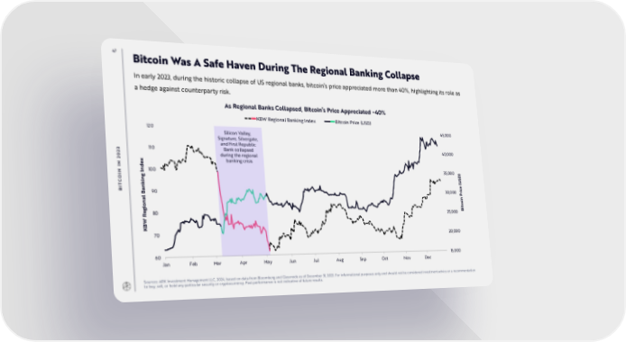47 Bitcoin Was A Safe Haven During The Regional Banking Collapse In early 2023, during the historic collapse of US regional banks, bitcoin’s price appreciated more than 40%, highlighting its role as a hedge against counterparty risk. As Regional Banks Collapsed, Bitcoin’s Price Appreciated ~40% KBW Regional Banking Index Bitcoin Price (USD) 120 Silicon Valley, 45,000 Signature, Silvergate, and First Republic 3 110 Bank collapsed 40,000 2 during the regional 0 2 x banking crisis N e I Ind100 35,000 N OI ing C T ank BI B 90 30,000 nal gio Bitcoin Price (USD) e 80 25,000 R W KB 70 20,000 60 15,000 Jan Feb Mar Apr May Jun Jul Aug Sep Oct Nov Dec Sources: ARK Investment Management LLC, 2024, based on data from Bloomberg and Glassnode as of December 31, 2023. For informational purposes only and should not be considered investment advice or a recommendation to buy, sell, or hold any particular security or cryptocurrency. Past performance is not indicative of future results.