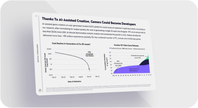 71 Thanks To AI-Assisted Creation, Gamers Could Become Developers AI-assisted game creation on user-generated content (UGC) platforms could cause an explosion in gaming content. According to our research, after normalizing for output quality, the cost of generating a single 3D asset has dropped ~99% at an annual rate to less than $0.06 since 2021. AI should democratize content creation and accelerate the growth in UGC. Roblox already has delivered more than ~470 million experiences globally, 52x the combined number of PC, console, and mobile app games. S Cost Decline In Generative AI For 3D Assets* Number Of Video Game Releases R Traditional Games Mobile Games Roblox Experiences E M $1,000 U $1E+03 S >99% 109 N t Annualized r 1.E+03 e $100 e CO $1E+02 8 Generative AI lowers the s 1.E+02 L As Cost Decline b 10 A m ) cost of UGC. T u e 107 I D ) $10 l1.E+01 G 3 $1E+01 N a le r a e c 6 Atari e c 1.E+00 DI p S iv S 10 t g introduces the t g $1 a o s $1E+00 5 l 1.E-01 o (Lo u (L 10 Atari 2600. C m 4 1.E-02 ar u 10 l $0.1 Apple launches l $1E-01 C o 103 D 1.E-03 the first iPhone. 102 $1$0E-.0021 1.E-04 Oct-21 Feb-22 May-22 Aug-22 Dec-22 Mar-23 1975 '78 '81 '84 '87 '90 '93 '96 '99 '02 '05 '08 '11 '14 '17 '20 '22 Date of Publication *We normalize the cost of 3D asset generation by each model’s CLIP R-Precision scores. Sources: ARK Investment Management LLC, 2024. This ARK analysis is based on a range of underlying data from external sources, including Nichol et al. 2022, which may be provided upon request. Forecasts are inherently limited and cannot be relied upon. For informational purposes only and should not be considered investment advice or a recommendation to buy, sell, or hold any particular security. Past performance is not indicative of future results.