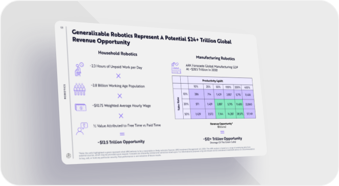 121 Generalizable Robotics Represent A Potential $24+ Trillion Global Revenue Opportunity Household Robotics Manufacturing Robotics ARK Forecasts Global Manufacturing GDP ~2.3 Hours of Unpaid Work per Day At ~$28.5 Trillion In 2030 × Productivity Uplift S ~2.8 Billion Working Age Population 10% 25% 50% 100% 200% 400% IC T O 10% 286 714 1,429 2,857 5,715 11,430 B × e RO t a R 20% 571 1,429 2,857 5,715 11,430 22,860 ~$10.75 Weighted Average Hourly Wage e k Ta × 50% 1,429 3,572 7,144 14,287 28,575 57,149 ½ Value Attributed to Free Time vs Paid Time Revenue Opportunity* = (Billions) = ~$12.5 Trillion Opportunity ~$12+ Trillion Opportunity (Average Of The Green Cells) *Note: the cells highlighted in green represent what ARK believes to be a reasonable or likely outcome. Sources: ARK Investment Management LLC, 2024. This ARK analysis is based on a range of underlying data from external sources, which may be provided upon request. Forecasts are inherently limited and cannot be relied upon. For informational purposes only and should not be considered investment advice or a recommendation to buy, sell, or hold any particular security. Past performance is not indicative of future results.
