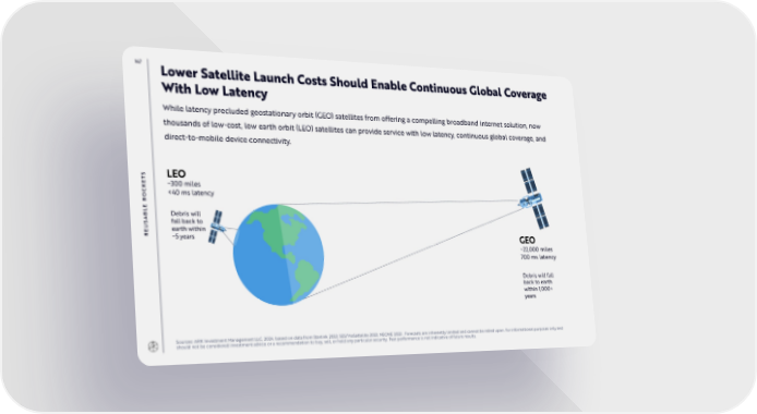 147 Lower Satellite Launch Costs Should Enable Continuous Global Coverage With Low Latency While latency precluded geostationary orbit (GEO) satellites from offering a compelling broadband internet solution, now thousands of low-cost, low earth orbit (LEO) satellites can provide service with low latency, continuous global coverage, and direct-to-mobile device connectivity. S LEO T E ~300 miles K C