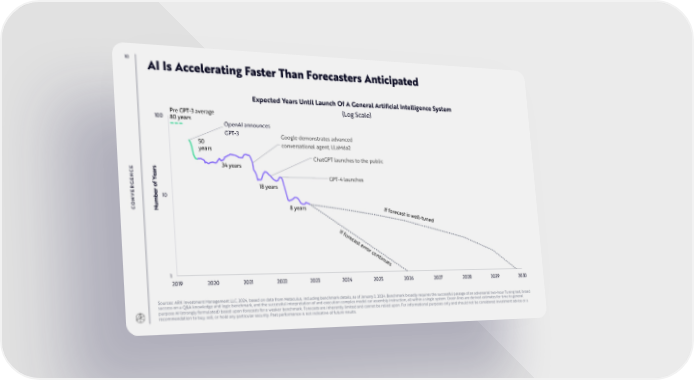 10 AI Is Accelerating Faster Than Forecasters Anticipated Expected Years Until Launch Of A General Artificial Intelligence System Pre GPT-3 average (Log Scale) 100 80 years OpenAIannounces GPT-3 Google demonstrates advanced 50 conversational agent, LLaMda2 years ChatGPTlaunches to the public s 34 years CE r a N e GPT-4 launches E Y G f o 18 years R E r V e10 N b m CO Nu 8 years If for ecast is wel l - tun e d If for ecast er r or con tin ues 1 2019 2020 2021 2022 2023 2024 2025 2026 2027 2028 2029 2030 Sources: ARK Investment Management LLC, 2024, based on data from Metaculus, including benchmark details, as of January 3, 2024. Benchmark broadly requires the successful passage of an adversarial two-hour Tuning test, broad success on a Q&A knowledge and logic benchmark, and the successful interpretation of and execution complex model car assembly instruction, all within a single system. Green lines are derived estimates for time to general purpose AI (strongly formulated) based upon forecasts for a weaker benchmark. Forecasts are inherently limited and cannot be relied upon. For informational purposes only and should not be considered investment advice or a recommendation to buy, sell, or hold any particular security. Past performance is not indicative of future results.