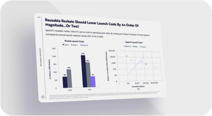 145 Reusable Rockets Should Lower Launch Costs By An Order Of Magnitude…Or Two! SpaceX’s reusable rocket, Falcon 9, put an end to soaring launch costs. By reusing one Falcon 9 booster 19 times, SpaceX increased its annual launch cadence nearly 60% to 96 in 2023. Rocket Launch Costs SpaceX Launch Costs* Soyuz Atlas V Falcon 9 Historical 2023e Forecast S $250 $100,000 T s E ar K $210 l C l o RO D $10,000 $200 E 3 L 2 B s 0 $164 2 A ar , S l it U l b $1,000 o $150 r D RE O 15 $118 h 0 t 2 ar $100 , E ns $100 io w l o L il $71 $71 $10 o M t $ g $50 k / $ $1 1 100 10,000 1,000,000 100,000,000 $- Cumulative Upmass 2006 2015 (kg) *Forecast timeline dependent on the speed of development of SpaceX's Starship. Sources: ARK Investment Management LLC, 2024. This ARK analysis is based on a range of underlying data from external sources, which may be provided upon request. Forecasts are inherently limited and cannot be relied upon. For informational purposes only and should not be considered investment advice or a recommendation to buy, sell, or hold any particular security. Past performance is not indicative of future results.