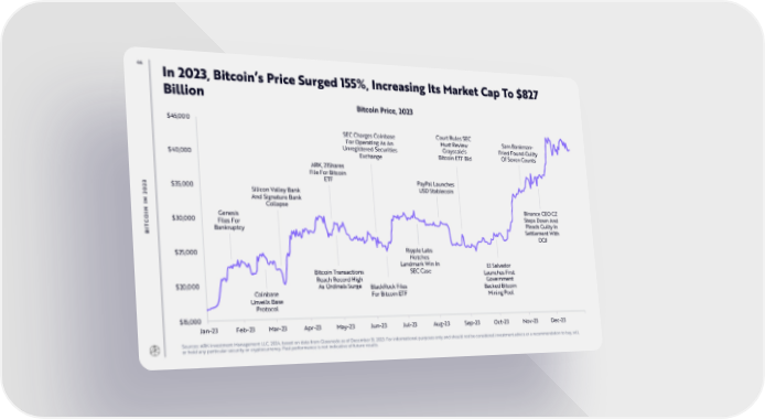 44 In 2023, Bitcoin’s Price Surged 155%, Increasing Its Market Cap To $827 Billion Bitcoin Price, 2023 $45,000 SEC Charges Coinbase Court Rules SEC Sam Bankman- For Operating As An Must Review Unregistered Securities Grayscale’s Fried Found Guilty $40,000 Exchange Bitcoin ETF Bid Of Seven Counts ARK, 21Shares File For Bitcoin 3 ETF PayPal Launches 2 $35,000 Silicon Valley Bank USD Stablecoin 0 2 And Signature Bank N I Collapse N Genesis Binance CEO CZ OI $30,000 Files For Steps Down And C Pleads Guilty In T Bankruptcy BI Settlement With DOJ $25,000 Ripple Labs Notches Landmark Win In El Salvador Bitcoin Transactions SEC Case Launches First $20,000 Reach Record High Government As Ordinals Surge BlackRock Files Backed Bitcoin Coinbase For Bitcoin ETF Mining Pool Unveils Base Protocol $15,000 Jan-23 Feb-23 Mar-23 Apr-23 May-23 Jun-23 Jul-23 Aug-23 Sep-23 Oct-23 Nov-23 Dec-23 Sources: ARK Investment Management LLC, 2024, based on data from Glassnode as of December 31, 2023. For informational purposes only and should not be considered investment advice or a recommendation to buy, sell, or hold any particular security or cryptocurrency. Past performance is not indicative of future results.
