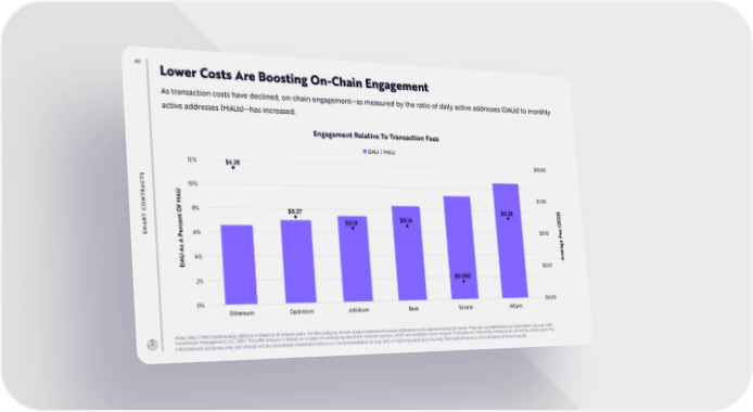60 Lower Costs Are Boosting On-Chain Engagement As transaction costs have declined, on-chain engagement—as measured by the ratio of daily active addresses (DAUs) to monthly active addresses (MAUs)—has increased. Engagement Relative To Transaction Fees DAU / MAU 12% $6.28 $10.00 S T C 10% A R T AU $1.00 N M O C f 8% ) O $0.27 $0.28 3 T 2 R nt $0.13 $0.16 0 A ce (2 r SM e 6% $0.10 e P e F A age As r e AU 4% Av D $0.01 2% $0.003 0% $0.00 Ethereum Optimism Arbitrum Base Solana zkSync Note: DAU / MAU traditionally refers to a measure of unique users. For this analysis, we are using a measure of unique addresses as an approximation for users. They are correlated but not equivalent. Sources: ARK Investment Management LLC, 2024. This ARK analysis is based on a range of underlying data from external sources, which are available upon request. Forecasts are inherently limited and cannot be relied upon. For informational purposes only and should not be considered investment advice or a recommendation to buy, sell, or hold any particular security. Past performance is not indicative of future results.