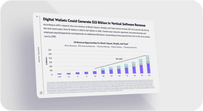 86 Digital Wallets Could Generate $23 Billion In Vertical Software Revenue According to ARK’s research, the core revenue of Block’s Square, Shopify, and Toast should increase 22% at an annual rate during the next seven years, from $7 billion in 2023 to $27 billion in 2030. Closed loop consumer payments, merchant banking, and employee payroll/payments could generate an additional $23 billion, accelerating revenue growth from 22% to 33% at an annual rate by 2030. US Revenue Opportunities For Block’s Square, Shopify, And Toast* Core Revenues Closed Loop Payments Merchant Banking Payroll Software Employee Payments S T E $60 L L A $50 W L A T ns $40 33% CAGR I io G l DI il $30 B $ $20 $10 $- 2019 '20 '21 '22 '23E '24E '25E '26E '27E '28E '29E '30E *Core revenues include software revenue, net open-loop payment revenue, merchant lending revenue, and revenue attributable to all other extant business lines. Merchant banking revenue includes both net interest income and noninterest revenue attributable to merchant deposits and lending not already captured by our forecast for Block, Shopify, and Toast’s working capital financing business. All revenue segments excluding net open-loop payment revenue, closed-loop payment revenue, and employee payment revenue are represented on a gross basis, and all revenue will be shared between the software platforms and all enabling market participants such as other fintechs or sponsoring financial institutions. We use our status quo forecasts the software platforms’ net take rates to estimate net employee payment revenue and do not explicitly estimate incremental cost synergies from employee closed-loop payments. We view all revenue segments except for core revenues not as explicit forecasts but as addressable opportunities in the US for Block’s Square, Shopify, and Toast. We primarily model Block’s historical revenue and future revenue opportunity across its Square merchant ecosystem and do not incorporate Cash App or Afterpay revenues independent of Square. Sources: ARK Investment Management LLC, 2024. This ARK analysis is based on a range of underlying data from external sources, which may be provided upon request. Forecasts are inherently limited and cannot be relied upon. For informational purposes only and should not be considered investment advice or a recommendation to buy, sell, or hold any particular security. Past performance is not indicative of future results.