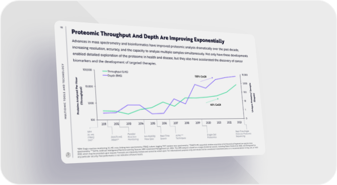 98 Proteomic Throughput And Depth Are Improving Exponentially Advances in mass spectrometry and bioinformatics have improved proteomic analysis dramatically over the past decade, increasing resolution, accuracy, and the capacity to analyze multiple samples simultaneously. Not only have these developments enabled detailed exploration of the proteome in health and disease, but they also have accelerated the discovery of cancer biomarkers and the development of targeted therapies. Y G O 100,000 Throughput (LHS) 10,000 L 120% CAGR O Depth (RHS) HN r C u 1,000 e E o l T H p D r 10,000 am N e ) S P t A u 100 / d h) S e ins t L yz ghp e p O u t e O o o T 10 r (D Analhr P C 1,000 (T 40% CAGR e MI ins u e O t 1 niq I o T r U L P MU 100 0 2011 2012 2013 2014 2015 2016 2017 2018 2019 2020 2021 2022 2023 SRM XL-MS Parallel Real-Time Single ITRAQ SWATH-MS Reaction Ion-Mobility Real-Time AI/ML*** Single-Cell Molecule Proteomic TMT* HRAM** Monitoring Mass Spec Search Techniques Proteomics Sequencing *SRM: Single reaction monitoring; XL-MS: cross-linking mass-spectrometry; ITRAQ: isobaric tagging; TMT: tandem mass spectrometry. **SWATH-MS: sequential window acquisition of all theoretical fragment ion spectra mass spectrometry. ***AI/ML: Artificial Intelligence/Machine Learning. Sources: ARK Investment Management LLC, 2024. This ARK analysis is based on a range of external sources, including Peters-Clarke et al. 2023, and Zhang and Cui 2022, which may be provided upon request. Forecasts are inherently limited and cannot be relied upon. For informational purposes only and should not be considered investment advice or a recommendation to buy, sell, or hold any particular security. Past performance is not indicative of future results.