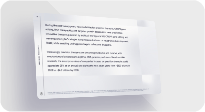 88 During the past twenty years, new modalities for precision therapies, CRISPR gene editing, RNA therapeutics and targeted protein degradation have proliferated. Innovative therapies powered by artificial intelligence (AI), CRISPR gene editing, and new sequencing technologies have increased returns on research and development (R&D), while enabling undruggable targets to become druggable. S E PI A R E Increasingly, precision therapies are becoming multiomic and curative, with H T N mechanisms of action spanning DNA, RNA, proteins, and more. Based on ARK's O I S I C research, the enterprise value of companies focused on precision therapies could E PR appreciate 28% at an annual rate during the next seven years, from ~$820 billion in 2023 to ~$4.5 trillion by 2030. Sources: ARK Investment Management LLC, 2024. This ARK analysis is based on a range of external sources, which may be provided upon request. Forecasts are inherently limited and cannot be relied upon. For informational purposes only and should not be considered investment advice or a recommendation to buy, sell, or hold any particular security. Past performance is not indicative of future results.